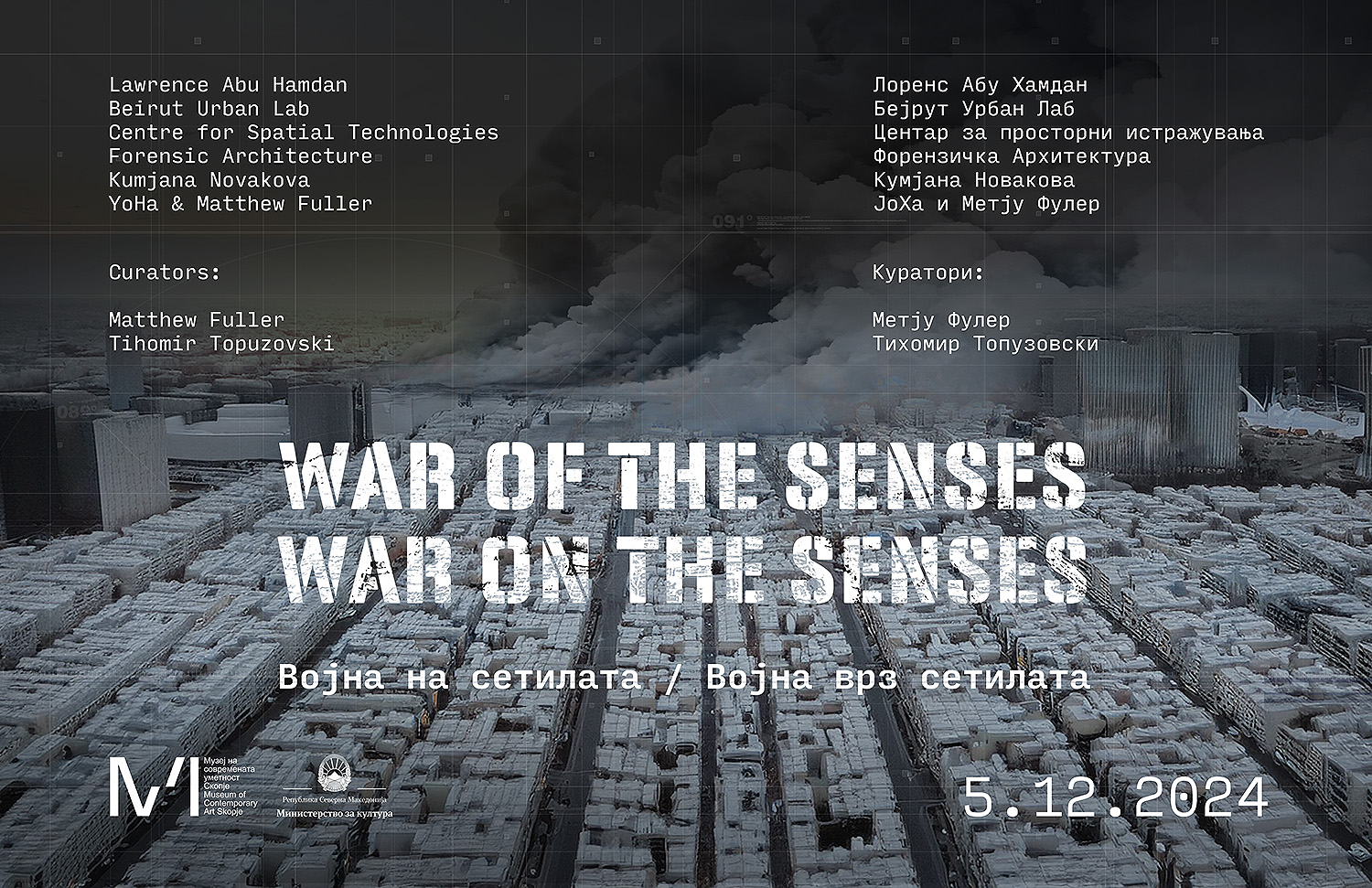 Во поставката „Војна на сетилата/Војна врз сетилата“ ќе бидат изложени дела на интернационални и македонски автори: Лоренс Абу Хамдан, Бејрут урбан лаб, Центар за просторни технологии, Форензичка архитектура, Кумјана Новакова, во соработка со Метју Фулер ќе се претстават и Мацуко Јокоџи и Грахам Харвуд од колективот ЈоХа.
