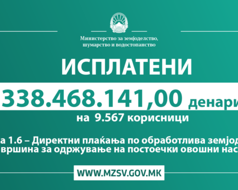 Извршена е исплата во износ од 338.468.141 денари кон 9.567 лица, информираат од Министерството за земјоделство, шумарство и водостопанство. Истата е реализирана согласно Мерка 1.6 – директни плаќања по обработлива површина за
