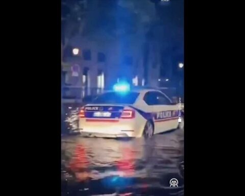 СКОПЈЕ (АА) – По ненадејните поплави во Париз поради силната бура што го погоди градот, забележано е полициско возило како се движи по поплавените улици и на звучник ја пушта познатата музика