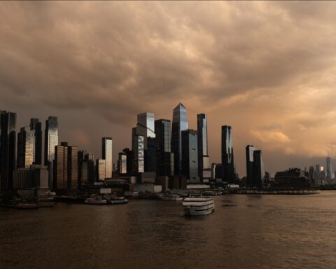 СКОПЈЕ (АА) – Грмотевично невреме проследено со силен дожд и ветер го погоди Њујорк, но токму тоа донесе спектакуларен крај на денот – зајдисонцето над Менхетен, по расчистувањето на небото, создаде спектакуларна