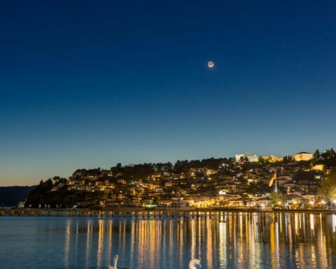 Фотографот Ристе Спироски направи впечатлив поглед на Месечината и Јупитер како висат над древното езеро Охрид во северна Македонија во ноќта на 29 април, заедно со пар лебеди кои ги набљудуваат ѕвездите,