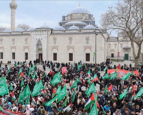 ИСТАНБУЛ (АА) – Платформата за солидарност со Газа организираше собир во Истанбул за поддршка на Палестинците, јавува Анадолу. На протестот остро беа осудени бруталните израелски напади во Појасот Газа и се повика