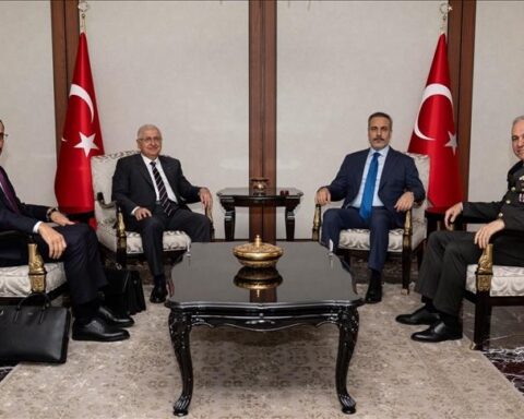 АНКАРА (АА) – Министерот за надворешни работи на Турција, Хакан Фидан, се состана со министерот за национална одбрана Јашар Ѓулер, началникот на Генералштабот, генерал Метин Ѓурак и директорот на Националната агенција за