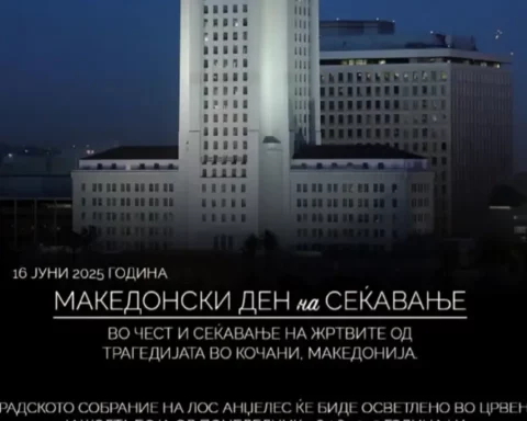Градското собрание на Лос Анџелес ќе биде осветлено во боите на македонското знаме во сеќавање на жртвите од трагедијата во Кочани
