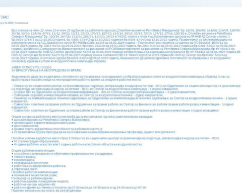 Нов оглас за вработување на кадри со завршено средно но и за советници со завршено високо образование, објави во петокот Акционерското друштво во државна сопственост за управување со воздушниот сообраќај и давање