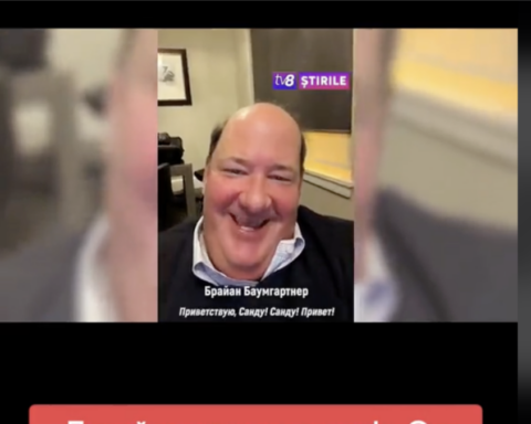 Со насмевка на лицето и со ведар глас, холивудскиот актер Брајан Баумгартнер гледа во камерата и на едвај дешифрирачки руски јазик ја повикува молдавската претседателка Маја Санду да поднесе оставка. Дури и