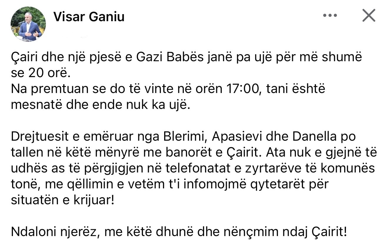 Жителите на Чаир и дел од општината Гази Баба се соочуваат со недостаток на вода повеќе од 20 часа, а градоначалникот на Општина Чаир, Висар Ганиу, остро реагираше преку објава на социјалните мрежи.