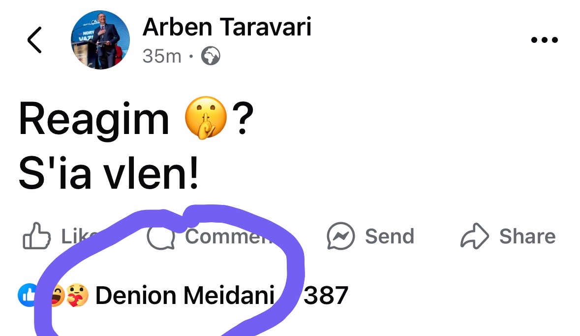 Наместо достоинствено да ја претставува албанската држава и да го зачува задолжителниот неутралитет, амбасадорот Меидани презема невиден чекор, лајкнува објава на Арбен Таравари, со која тој го иронизира актуелниот владин албански коалиционен партнер во владата на Република Северна Македонија – ВЛЕН.