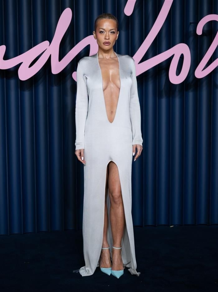 За посебната вечер, Рита одлучила да облече фустан во металик сива боја, кој е украсен со длабоко деколте, но и шлиц во долниот дел.