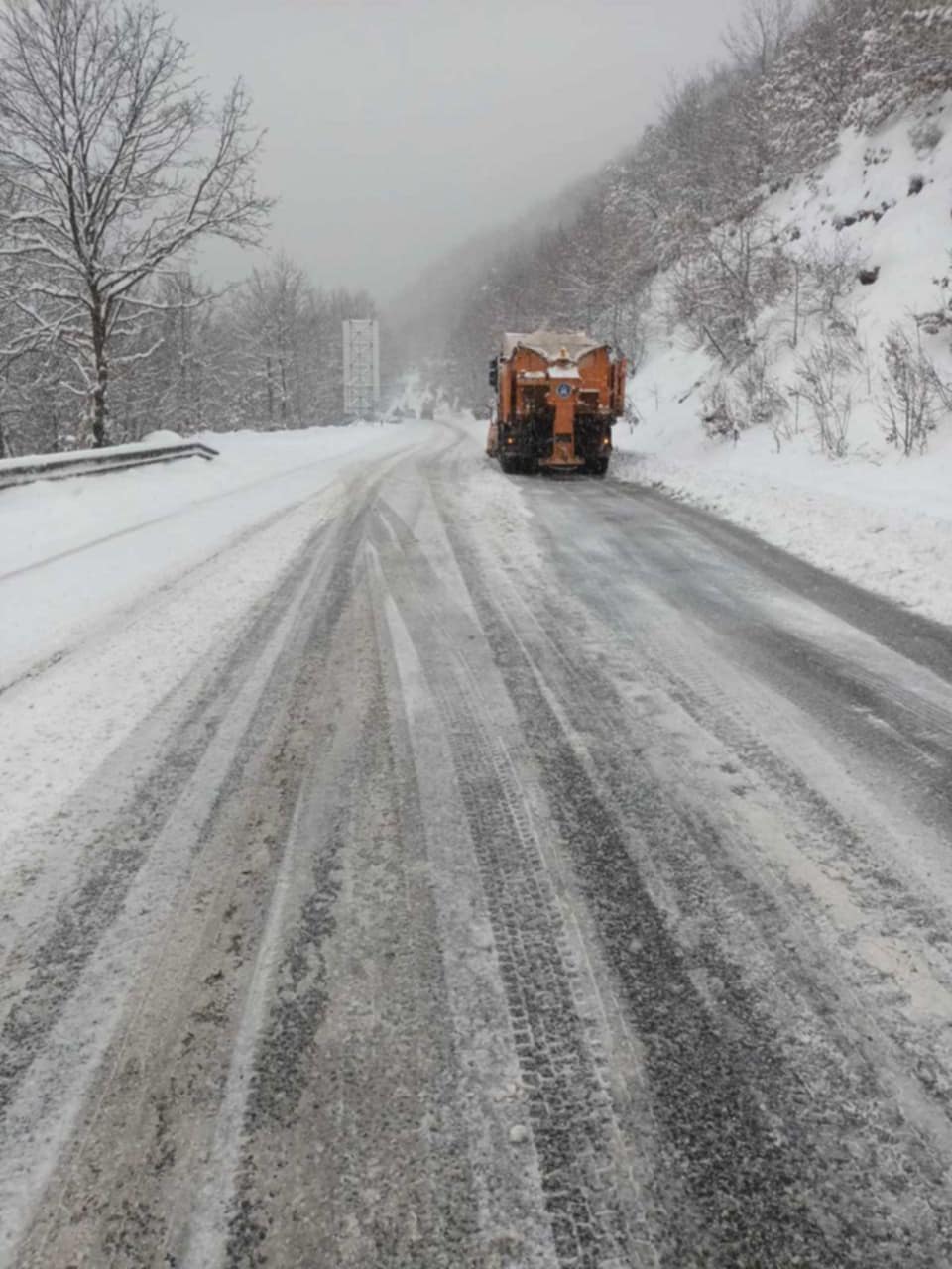 Сообраќајот на сите државни патишта се одвива во зимски услови со кажест снег на коловозот и затоа апелираме да се следи временската состојба и сите граѓани кои планираат да патуваат навреме да се информираат од сообраќајните служби за условите на државните патишта.