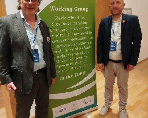 Претседателот на Работната група на словенските малцинства (АГСМ) Хартмут Лајпнер Претседателот на македонско друштво “Илинден”-Тирана, Никола Ѓурѓај во рамките на ФУЕН конгресот во Болзано во Јужен Тирол, Италија учестуваше на работен состанок