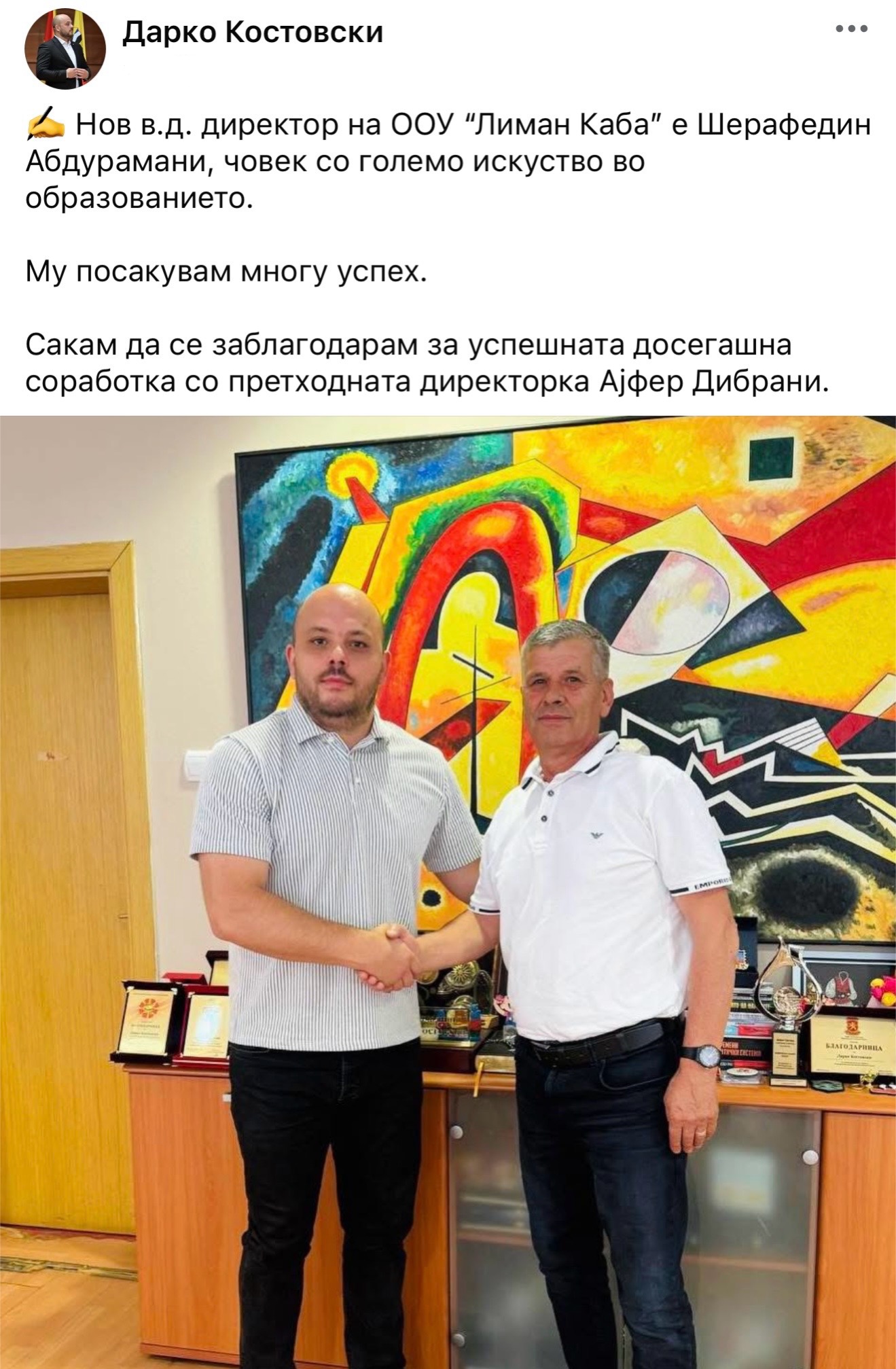 Градоначалникот на Општина Бутел, Дарко Костовски, го соопшти именувањето на Шерафедин Абдурамани за вршител на должност директор на ООУ „Лиман Каба“. Абдурамани, кој има долгогодишно искуство во образованието, се очекува да ја продолжи патеката на развој на ова училиште, а градоначалникот Костовски му посака многу успех во новата функција.