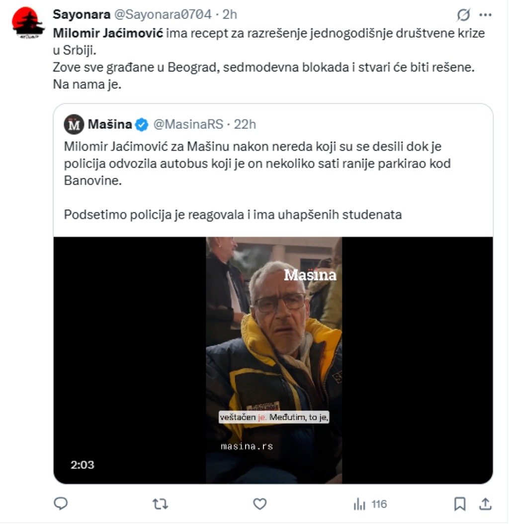 Ја поканувам цела Србија да се договори за датум и да оди во Белград седум дена, да го затвори Белград и никој да не оди никаде додека ова не се реши, бидејќи ова не може да се реши на друг начин – рече Јаќимовиќ и додаде дека „сега тоа е единствената опција што преостанува, и на народот е да одлучи“.