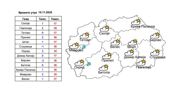 Во Скопје, наутро е можно слаба магла во делови од котлината, додека во текот на денот ќе преовладува сончево и претежно тихо време со мала до умерена облачност.