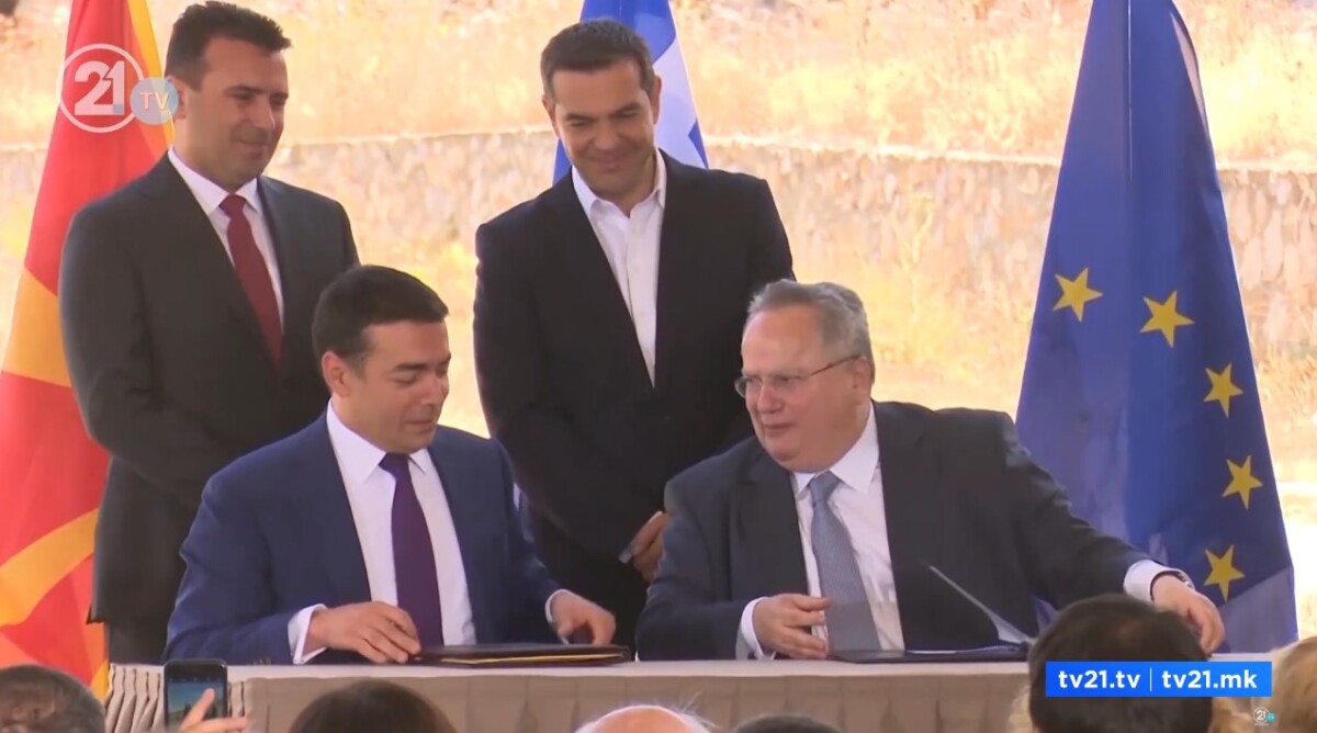 Договорот беше резултат на дипломатски напори во време кога на власт во Грција беше СИРИЗА, а во Македонија – СДСМ. Потпишан е од тогашните министри за надворешни работи, Никола Димитров и Никос Коѕијас, во присуство на премиерите Зоран Заев и Алексис Ципрас. На церемонијата присуствуваа и посредникот во преговорите Метју Нимиц, поранешниот еврокомесар за проширување Јоханес Хан, поранешната висока претставничка на ЕУ Федерика Могерини, како и други високи претставници од меѓународната заедница и од двете земји.