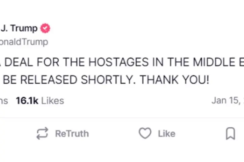 – Имаме договор за заложниците во Блиски Исток. Тие ќе бидат ослободени наскоро. Ви благодариме!, објави Трамп на социјалната мрежа „Трут“ (Truth).
