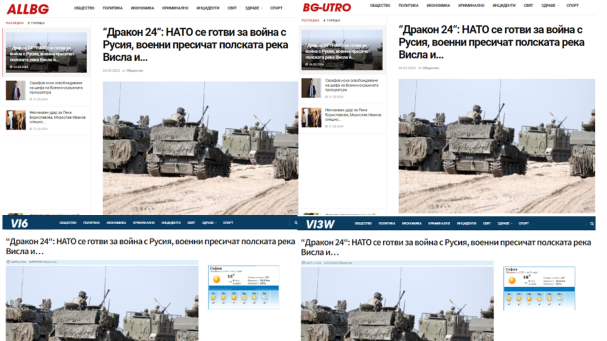 Најмалку 25 бугарски веб-страници, многу од нив се појавуваат како легитимни веб-страници за вести, објавија лажни вести за вежбите на НАТО, според неодамнешниот извештај на Дигиталната форензичка истражувачка лабораторија (DFRLab), аналитичка единица за дезинформации на Атлантскиот совет, тинк-тенк со седиште во Вашингтон. Една локална невладина организација неодамна објави дека бројот на такви веб-страници во Бугарија е 400.
